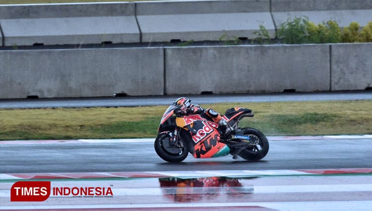 TIMES Ponorogo/Pembalap tim Red Bull KTM, Miguel Oliveira melahap trek basah Sirkuit Mandalika, saat lomba seri kedua MotoGP di Mandalika, Lombok, NTB, Minggu (20/3/2022). (FOTO: Tria Adha/TIMES Indonesia)
