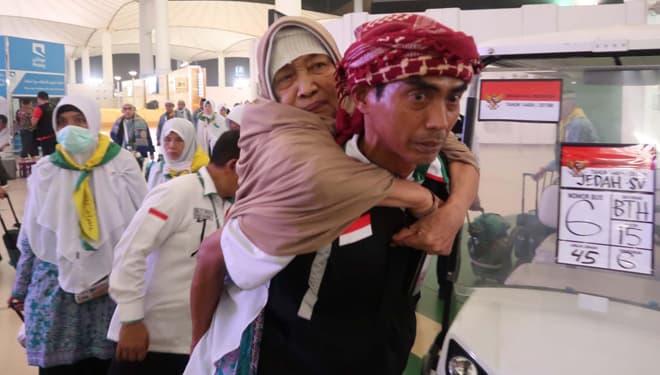 Petugas PPIH menggendong jemaah risti di bandara KAIA Jeddah, jelang pulang ke tanah air. (FOTO : istimewa).